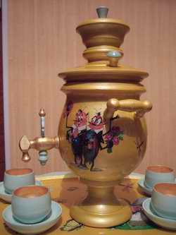 Самовар на подносе, с чашками "Муха Цокотуха". Шкатулка "Теремок". Фляга "Глоток Розы".